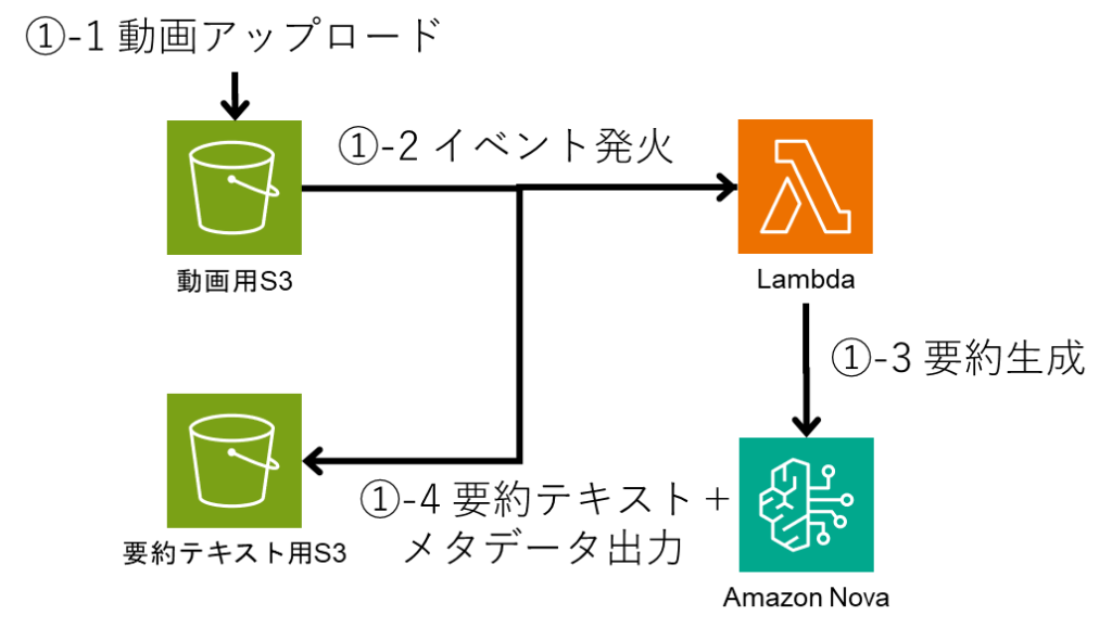 视频上传至 S3 后,Lambda 会接收事件触发,调用 Amazon Nova Lite 为这些视频生成说明文本,并将文本文件上传至 S3。